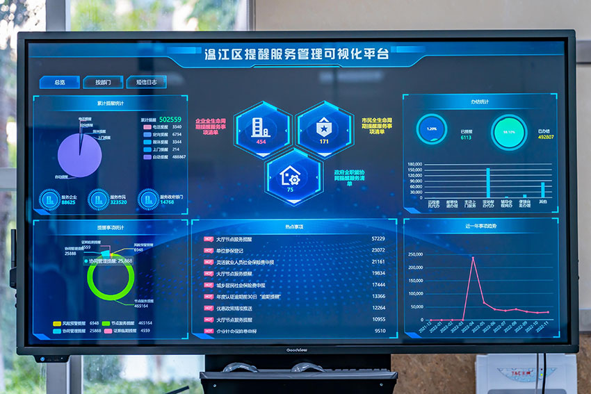 截至目前,全區已開展提醒服務910余萬次,其中證照臨期類2.95萬次、風險預警類326.4萬次、節點服務類578.1萬次、協同管理類2.55萬次,已辦結907.5萬次。