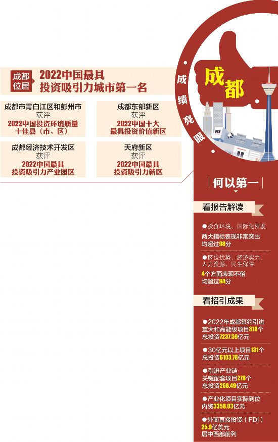 4月2日,由人民日報社旗下《環球時報》社主辦的第三屆環球城市招商引資推介大會在北京舉行,同時發布了“中國城市美好生活新發展——中國城市投資吸引力指數報告”。成都位居“2022中國最具投資吸引力城市”第一名。