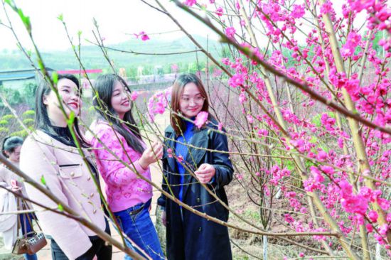3月28日,廣安區大龍鎮自力村大地花谷景區內,300余畝桃花迎著春風競相綻放。連綿的桃花形成十里桃林,呈現出“滿樹和嬌爛漫紅,萬枝丹彩灼春融”的絢麗畫面。