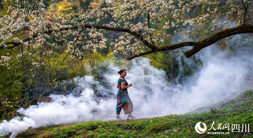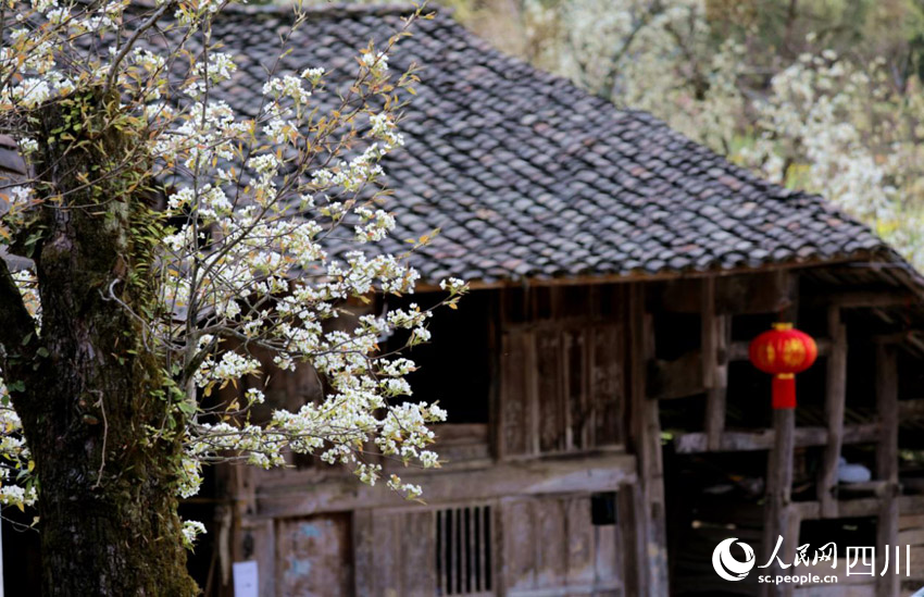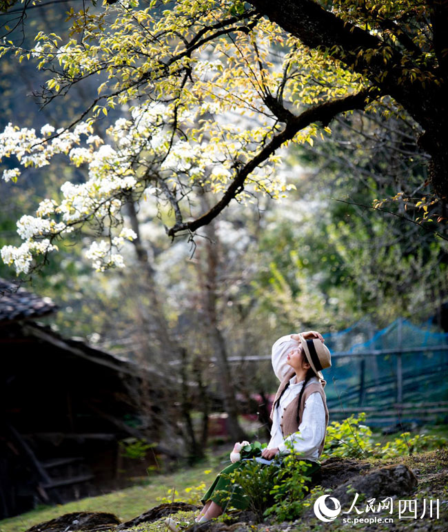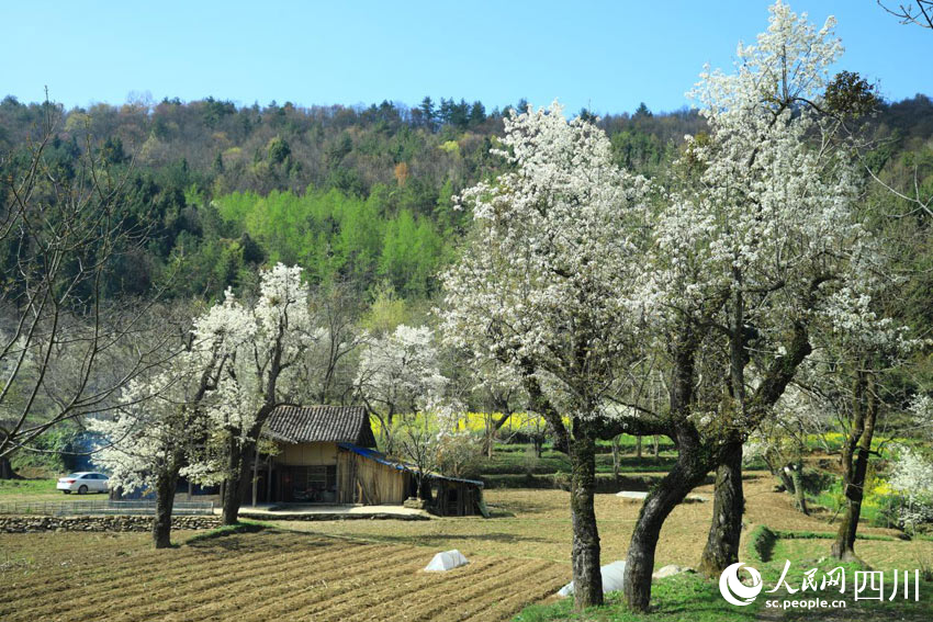 四川萬源:百年梨樹花綻放 游客賞花踏青來