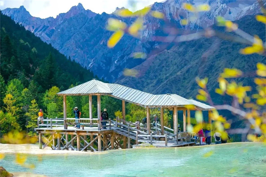 景區最大的彩池群落——五彩池作為黃龍的璀璨明珠,總是在四季美得別具一格。梯田式的彩池排列有序,水中色彩斑斕,呈現出繽紛奪目的光彩,清新的黃、澄澈的綠、沉靜的藍,無比令人炫目。(九寨溝景區、黃龍景區供圖)
