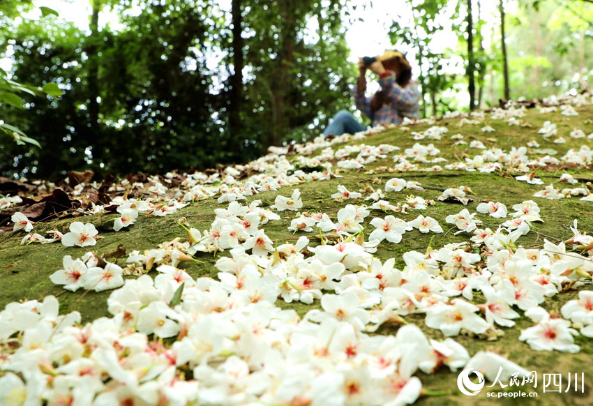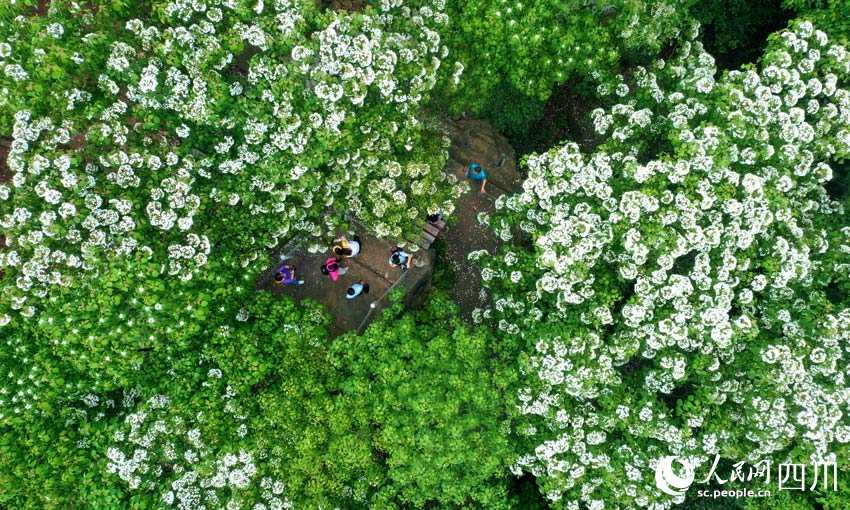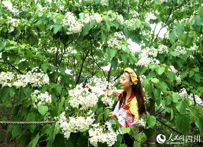 微風拂過,潔白的桐花從枝頭飄落,如雪似玉,紛紛揚揚。尋花而至的游客,記錄著夢幻般的美景,將好心情留在一片笑語歡聲中。