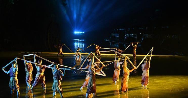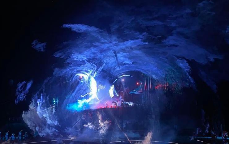 整場演出摘取威遠發展史上的高光片段和代表性文化元素,與燈光視效等互動手段相互結合,在山水間施展潑墨重彩,與舞美、投影虛實結合,組成了一幅美麗的全景式山水畫卷,營造出強烈的視覺效果和藝術沖擊力,讓觀眾在穹窿山水間享受視聽盛宴。