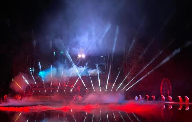 5月1日晚,川南首部大型山水實景演出《遇見威遠》在石板河旅游區震撼歸來。 圖為演出現場