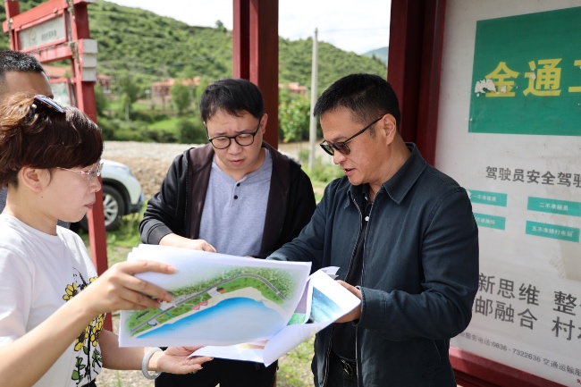 成都市錦江區第六批對口支援工作隊領隊、爐霍縣委常委、副縣長胡軍(右)在爐霍縣仁達鄉調研“1314”愛情專線項目建設情況。錦江區第六批對口支援工作隊供圖