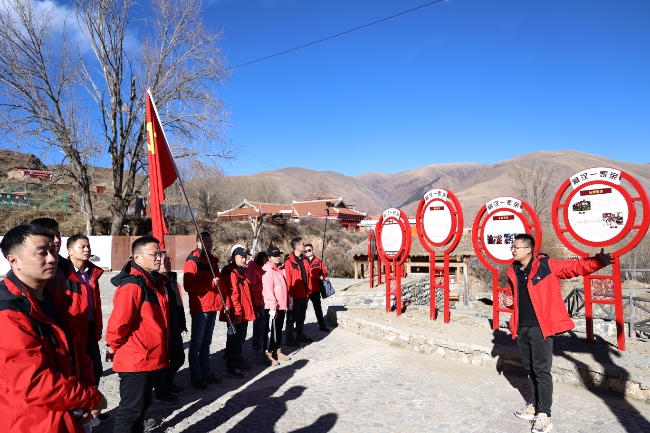 第六批工作隊隊員、掛職爐霍縣委組織部副部長鄭孝恒正在講解瓦達村基層黨建示范點建設情況.。錦江區第六批對口支援工作隊供圖