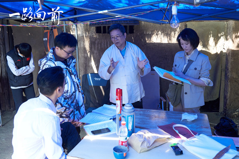 《一路向前》導演習辛和劇組成員討論劇本。劇組供圖