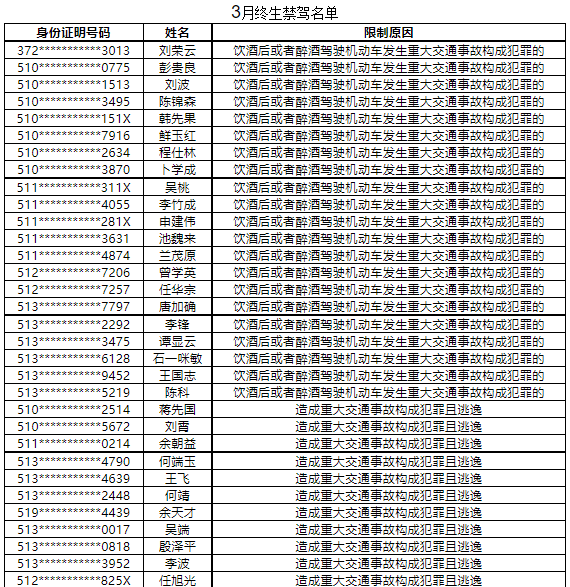 四川公安交警公布2023年3月、4月終身禁駕名單