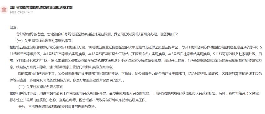 收到留言后,成都軌道交通集團規劃技術部于近日進行了回復。