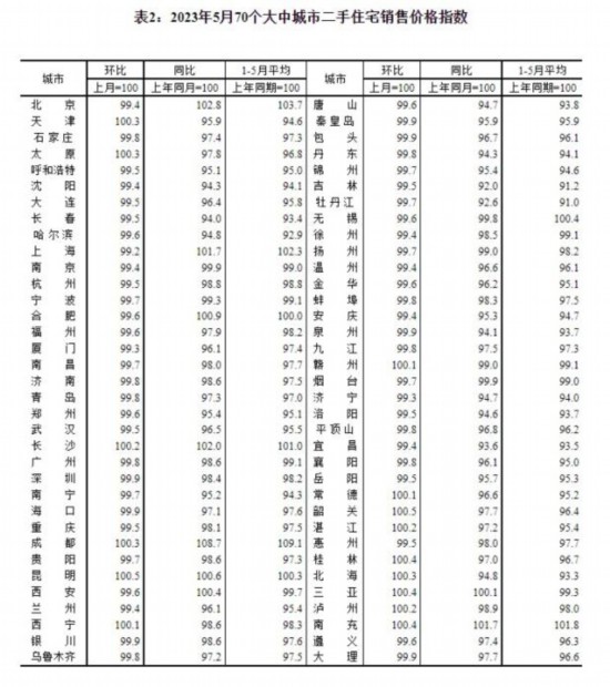 2023年5月70個大中城市二手住宅銷售價格指數。 截圖自國家統計局官網