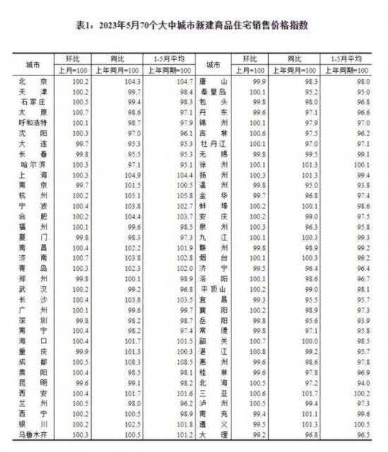 2023年5月70個大中城市新建商品住宅銷售價格指數。 截圖自國家統計局官網