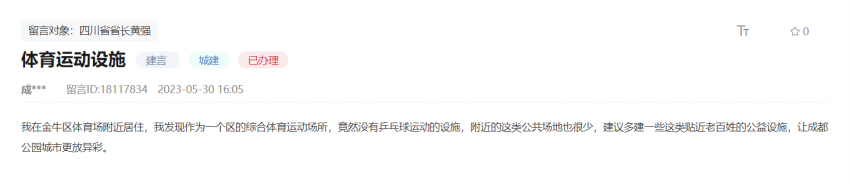 該網友在留言中表示,金牛區體育場作為區綜合體育運動場所,存在缺少乒乓球運動設施的情況。同時,體育場附近的同類公共場地也較少,希望能夠多建一些這類貼近老百姓的公益設施,讓成都公園城市更放異彩。