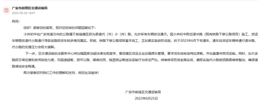 收到留言后,廣安市前鋒區交通運輸局高度重視,并進行了回復?;貜头Q,小井初中往廣安肖溪方向的公路屬于前鋒轄區段為縣道代(市)?。ň┞?,允許所有車輛依法通行。因小井初中附近渠華路(既有鐵路下穿公路項目)施工,貨運車輛需改道代小路通行導致該路段貨車較多情況屬實。6月下旬,鐵路下穿公路項目基本完工,正加緊實施安防設施。通車后,貨運車輛將通行渠華路,代小路的交通壓力會極大緩解。