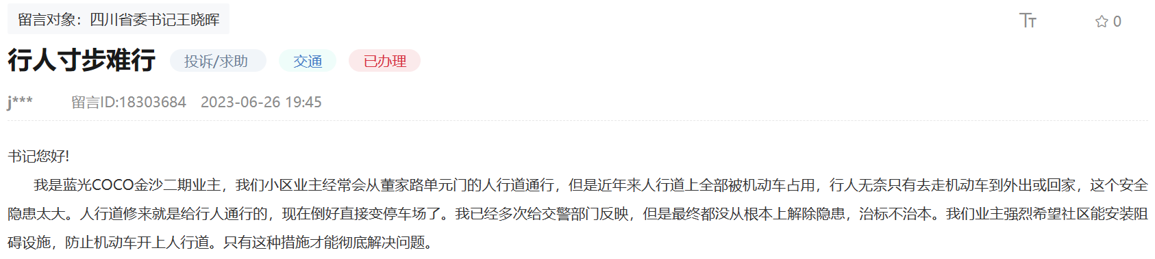人民網成都7月17日電 6月26日,有網友在人民網“領導留言板”欄目上留言:在成都市某小區門口的路段,人行道全部被機動車占用,行人只能走機動車道,存在很大安全隱患。業主希望社區能安裝阻礙設施,防止機動車開上人行道。