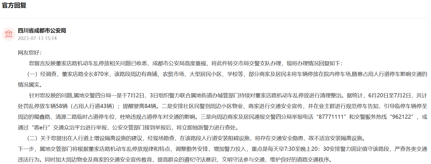 網友在留言中還提到,自己已經多次向相關部門反映,但都沒從根本上解除隱患。針對網友反映的相關問題,成都市公安局將此件轉交市局交警支隊辦理,并于7月13日予以回復。具體如下: