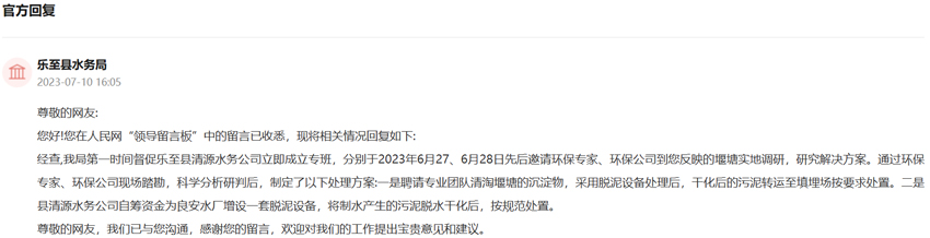 收到留言后,樂至縣水務局進行了回復?;貜头Q,經過調查后,水務局第一時間督促樂至縣清源水務公司立即成立專班,分別于2023年6月27、28日先后邀請環保專家、環保公司到網友反映的堰塘實地調研,研究解決方案。