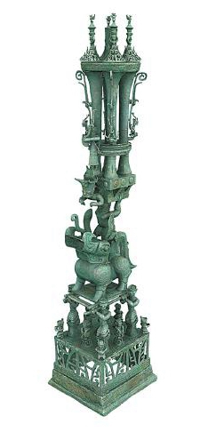 這件殘斷的器物整體呈多級塔臺狀,高約90厘米,底部約40厘米,由下到上大體可分為三部分。最下部為鏤空臺基,裝飾有植物狀鏤空紋飾。神壇中部為一個儀式活動的平臺;平臺之上共有13個小型青銅人像。青銅人像分為3組,每組4人。第一組人像雙手呈持握狀,跪于平臺四角。第二組人像頭為立發,身著裙裝,正襟坐于神壇每個側面中央的一個鏤空小平臺上。第三組人像更為高大強壯,各自跪在一個圓形臺基之上,4人共同抬起一個由8根銅桿組成的抬架。在中層平臺正中心,有一小山狀突起,其上有一跪姿人像。此人以一根帶子背負著一個圓罍。