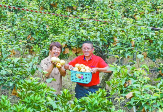 在廣安區龍安鄉勇敢村金太陽果園家庭農場,農場主楊太順、陳明香夫婦倆正在喜滋滋地采收成熟的梨子。