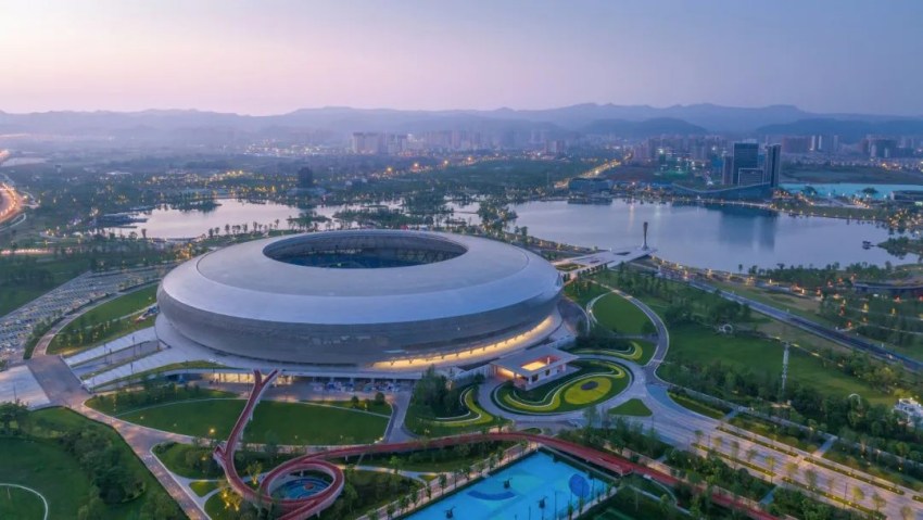 東安湖畔,呈“飛碟”造型的大運會主體育場有“太陽神鳥”圖騰懸浮屋面,寓意古蜀太陽神鳥與正圓科幻飛碟和諧共生,和體育場之外的“三館”相呼應,一同傳遞著中國文化的恢弘氣概。