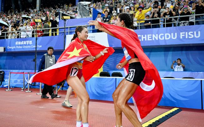 田徑項目女子10000米決賽賽后,冠軍、中國隊選手夏雨雨(前左)和亞軍、土耳其隊選手KILIC GONEN Yayla擁抱對方