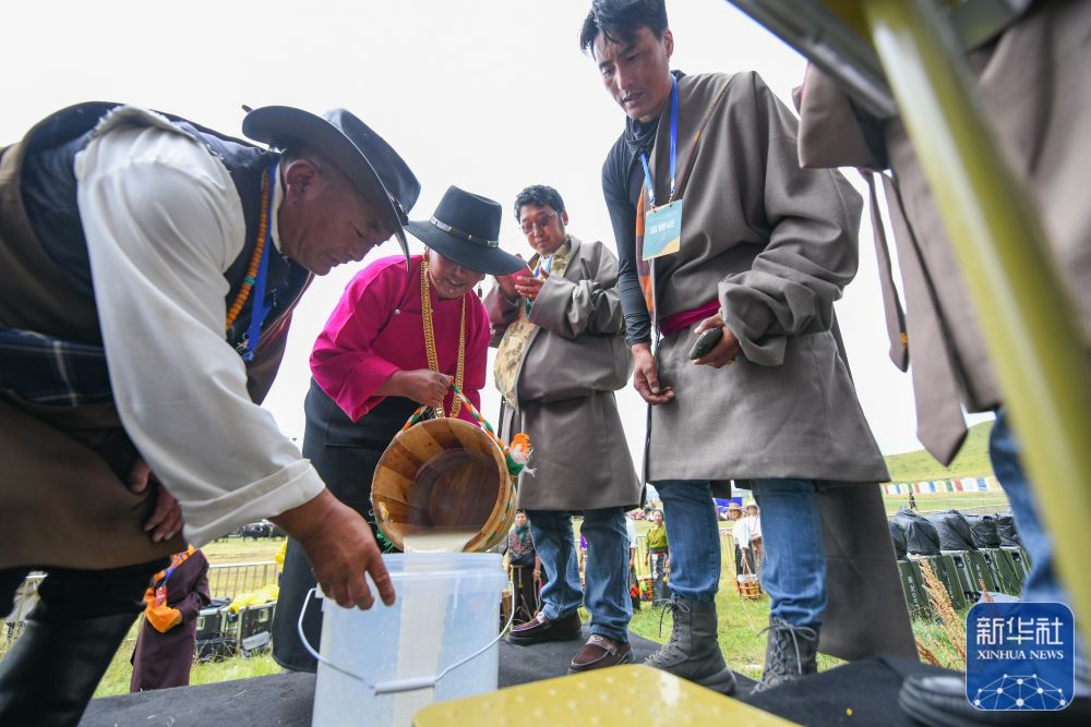 8月25日,在四川省阿壩藏族羌族自治州紅原縣雅克音樂牧場,參賽者在比賽結束后倒出牦牛奶稱重。