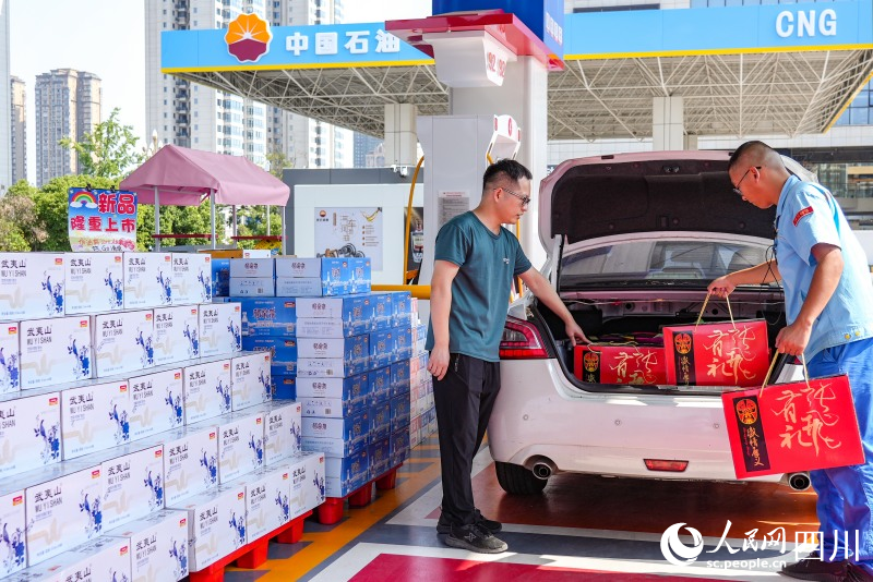 客戶在順濱站購買張飛牛肉大禮包。推廣當地特產也是加油站的工作之一。 趙月攝