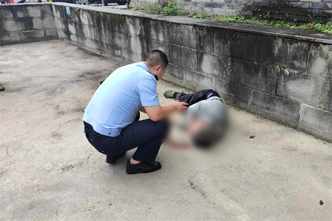 成都新都公安三河派出所巡組隊員對老人傷情進行查看。成都新都公安供圖