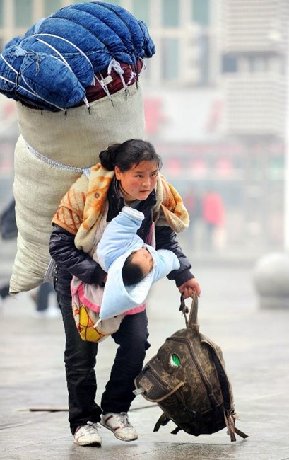 2010年1月30日,春運期間,南昌火車站。裝滿了一家人行李的編織袋,比人還高,沉甸甸的,壓彎了巴木玉布木的腰。正踏上春節返鄉路程的她,右手抱著襁褓中的孩子,左手還提著一個背包。這一幕,被新華社記者周科抓拍到,她因此成為當時轟動全網、感動廣大網友的“春運母親”。