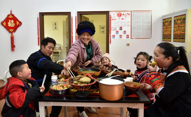 巴木玉布木(中)一家圍坐在桌前,敞亮的新房、豐盛的飯菜,歡聲笑語、其樂融融。周科攝