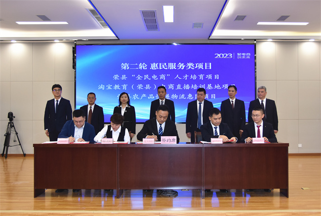 榮縣人民政府與成都洋蔥新未來網絡科技有限公司簽訂《榮縣“全民電商”人才培育項目合作協議書》;榮縣人民政府與阿里巴巴(中國)教育科技有限公司簽訂《淘寶教育(榮縣)電商直播培訓基地項目合作協議書》;榮縣數字縣域商業發展有限責任公司與自貢市中虹快遞服務有限公司簽訂《榮縣農產品快遞物流惠民項目合作協議書》3個惠民服務項目。