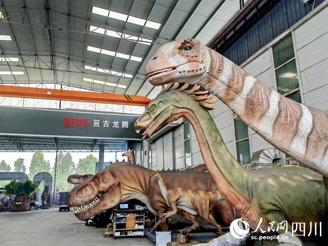走進自貢亙古龍騰科技有限公司(以下簡稱“亙古龍騰”)的生產車間,便仿佛置身侏羅紀世界:霸王龍的身體隨著嘶吼起伏顫抖,三角龍喘著粗氣鼻孔一鼓一鼓……如果大起膽子伸出手,兇猛的恐龍便會低頭過來嗅一嗅,仿佛對眼前的人類充滿好奇。
