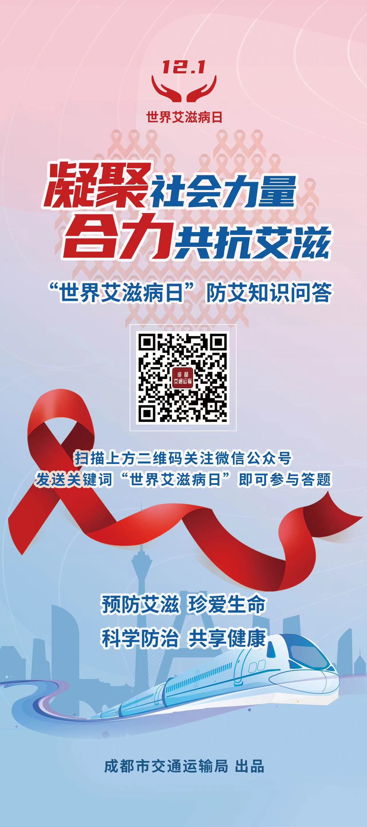 12月1日,第36個“世界艾滋病日”來臨之際,成都市交通運輸局聯合人民網四川頻道,開展以“凝聚社會力量 合力共抗艾滋”為主題的2023年“世界艾滋病日”主題活動?;顒又荚谛麄髌占胺腊R,推動艾滋病防治工作高質量開展。