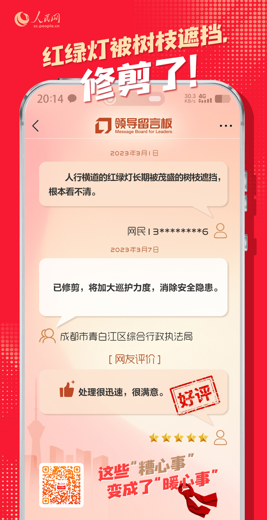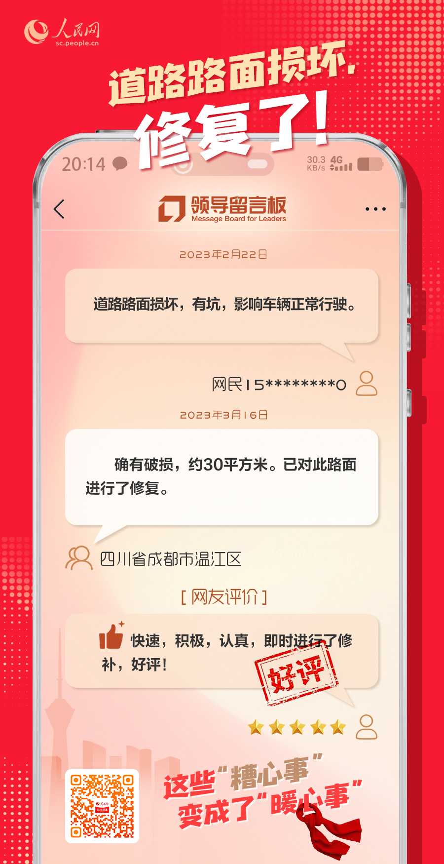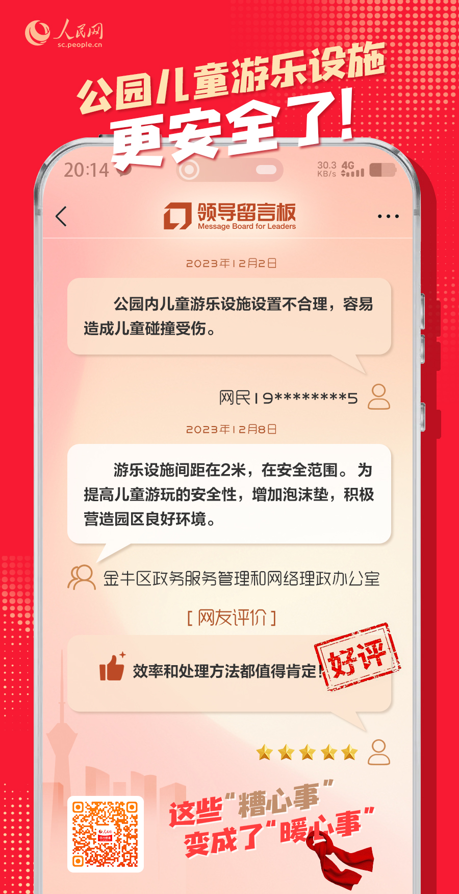 畫好網上網下“同心圓”,架好干群互動“連心橋”。2023年,四川各地各部門通過人民網“領導留言板”共收到群眾有效留言3.4萬余件,回復辦理“急難愁盼”3.3萬余件。2024年,新年伊始,人民網四川頻道盤點了過去一年四川網上群眾工作那些暖心故事,一起看看吧!