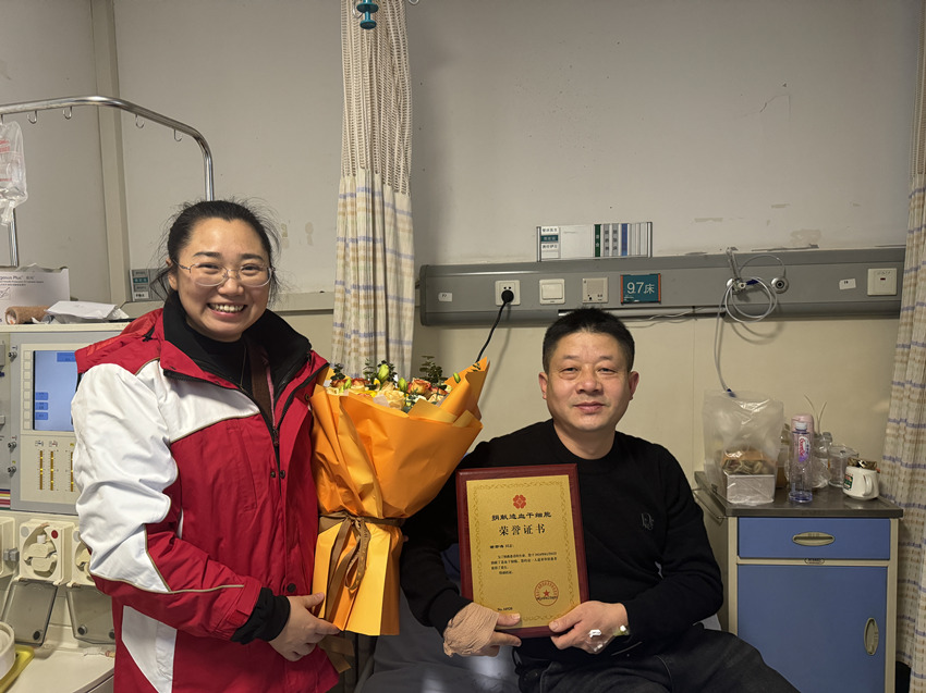 捐獻當天,紅十字會工作人員為謝榜濤(右)送上鮮花和榮譽證書。陳猛攝
