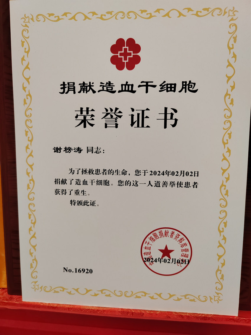 謝榜濤獲得捐獻造血干細胞榮譽證書。陳猛攝