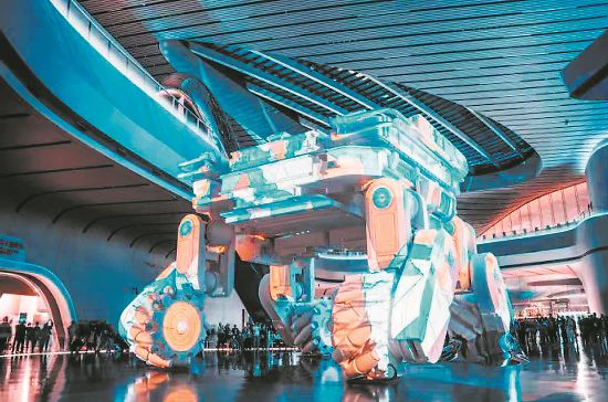 在館內大廳,科幻電影《流浪地球2》中的機械狗“笨笨”的巨型雕塑,已經成為游客喜愛的打卡點。據介紹,該巨型雕塑高達9米,由電影《流浪地球》系列導演郭帆親自參與創作,在激光照射下,“笨笨”可呈現多種皮膚外形,具有酷炫的視覺效果。