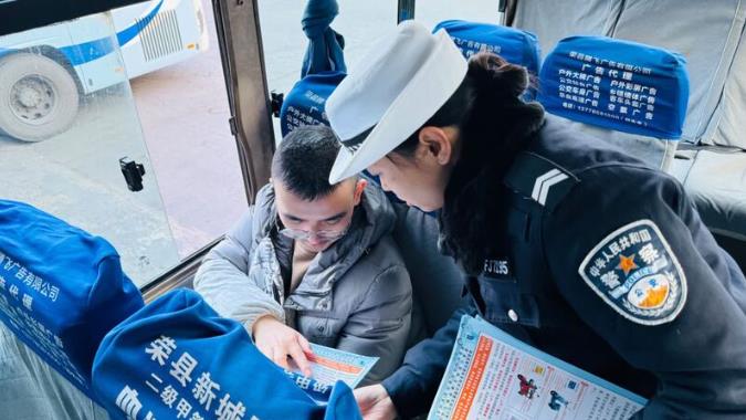 為在春運期間給過往司乘人員營造安全、有序、暢通的道路交通環境,榮縣交警在各關鍵路口設立臨時春運檢查點,檢查登記“兩危一客”車輛,提示車輛減速慢行,把好“出入關”。