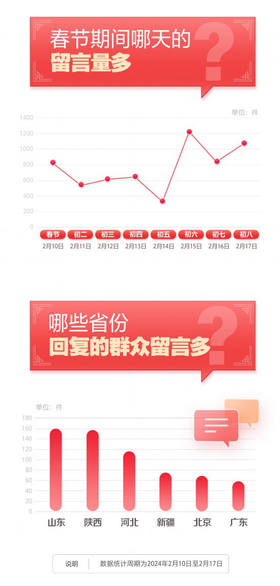 春節期間,各地領導干部及群眾留言辦理單位的工作人員仍然堅守崗位,全年無休為群眾排憂解難。據統計,2月10日(大年初一)至2月17日(大年初八),人民網“領導留言板”上共有946件群眾訴求和意見建議得到各地區各部門的回應,主要涉及道路出行、供水供暖、討薪維權和環境衛生等方面。其中,答復群眾留言最多的前6個省份依次為:山東、陜西、河北、新疆、北京、廣東。