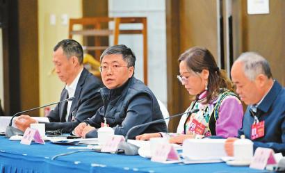 3月6日,十四屆全國人大二次會議四川代表團小組會議上,鐘波代表(左二)就加強綠色智能家電市場認證與監管問題發言。四川日報全媒體記者 歐陽杰 攝