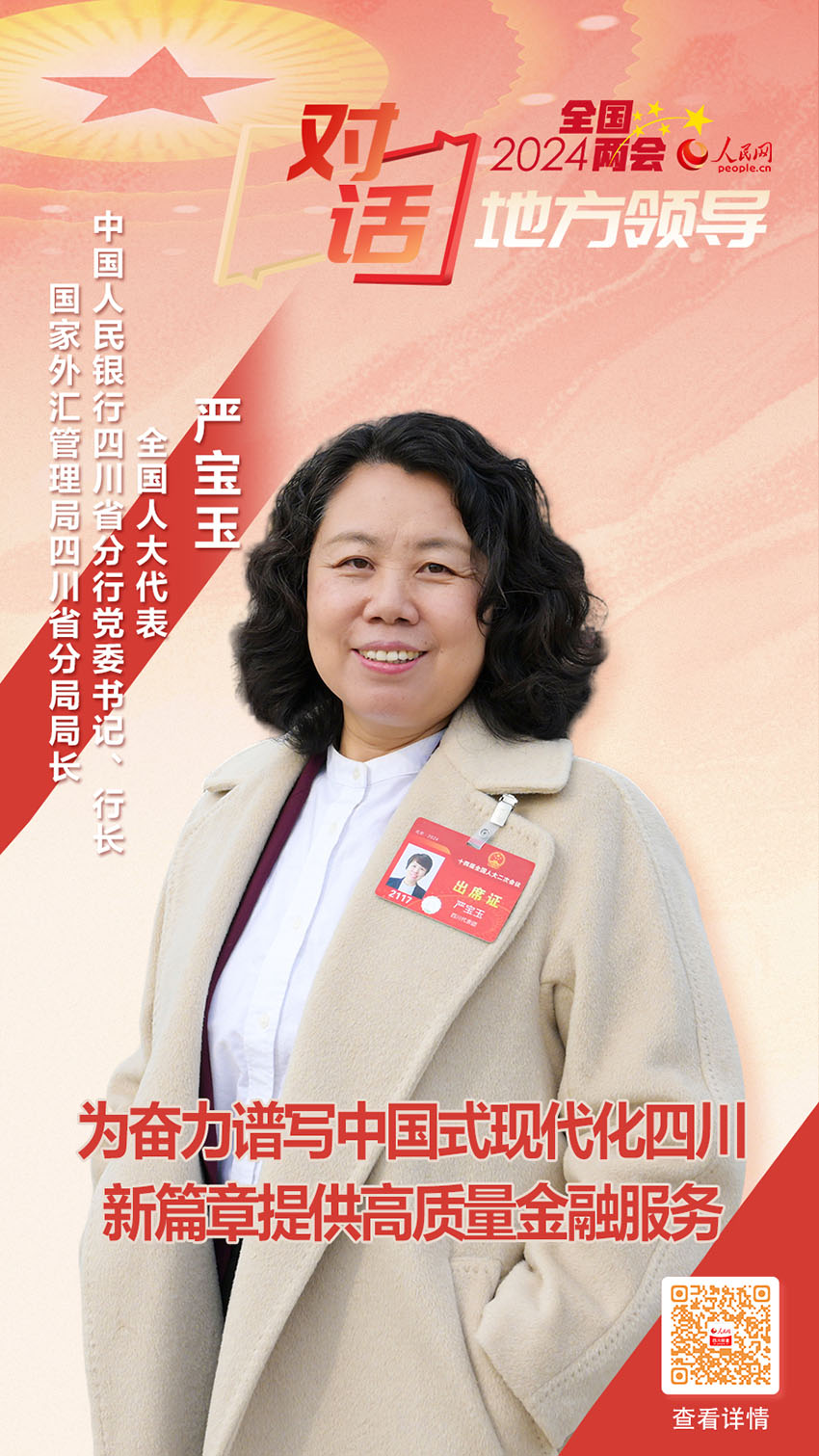 人民網北京3月7日電 (記者李平、王洪江)滿載全國人民的期盼、踏著春天的步伐,近3000名全國人大代表共赴一年一度的盛會。在2024全國兩會召開之際,全國人大代表、中國人民銀行四川省分行黨委書記、行長,國家外匯管理局四川省分局局長嚴寶玉接受了人民網記者專訪。