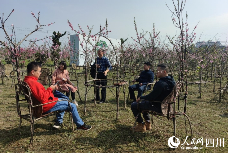 桃花朵朵競相開放,土地里生長著一排排造型各異的“家具”。四川省網聯會副會長、人民網股份有限公司四川分公司總經理薛育建帶領調研組一行來到“綠色環境產業化價值化子系統”展示區,深入體驗展區從環境美化到生態美化、從植物園林到公共空間、從農業種植到家具產業的轉變。