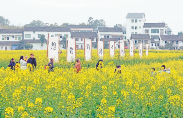 除此以外,活動現場還設置了多個打卡點。游客在賞花海、觀節目的同時,還可以參加“金色廣安·春歸花橋”美術、攝影、短視頻作品創作展評活動,體驗漢服傳統文化風情,品嘗地道壩壩席、壩壩茶,購買特色農產品,全方位感受春日勝景,體驗美麗鄉村新風貌。