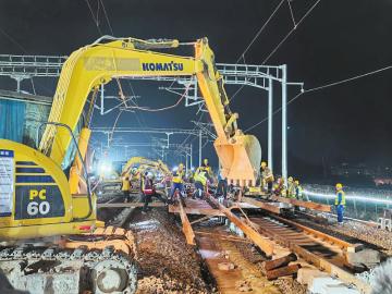 自3月10日首組道岔插鋪封鎖施工以來,現場300余名施工人員、8臺施工機械同時作業,歷經5個Ⅱ級天窗點封鎖施工,順利完成5組道岔的插鋪施工,拆除舊鋼軌340米、舊軌枕560余根,補充道砟400余立方米。至此,巴南高鐵全線軌道工程全部完成。