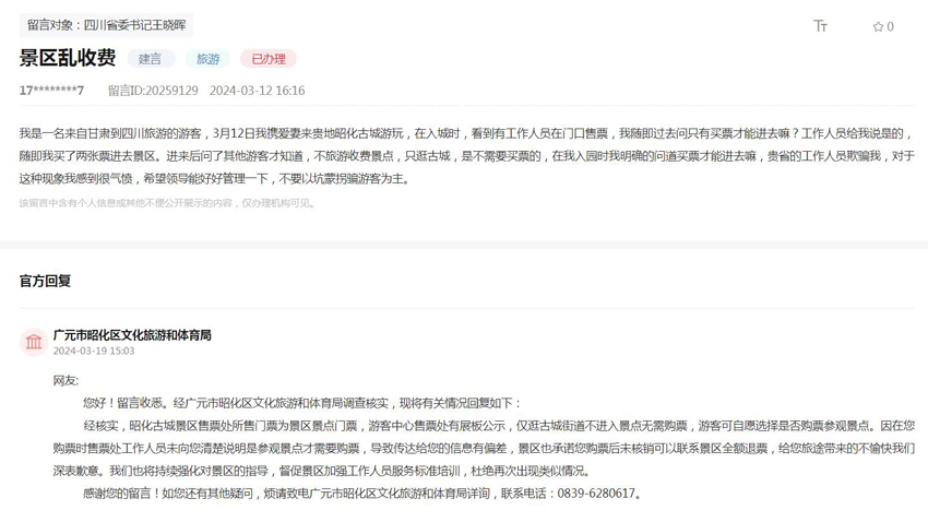 3月12日,一位甘肅網友在人民網“領導留言板”留言,反映了在廣元市昭化古城游玩時遇到了景區亂收費的情況。3月19日,昭化文旅體局公開回復網友,表示可以全額退票并致以歉意。