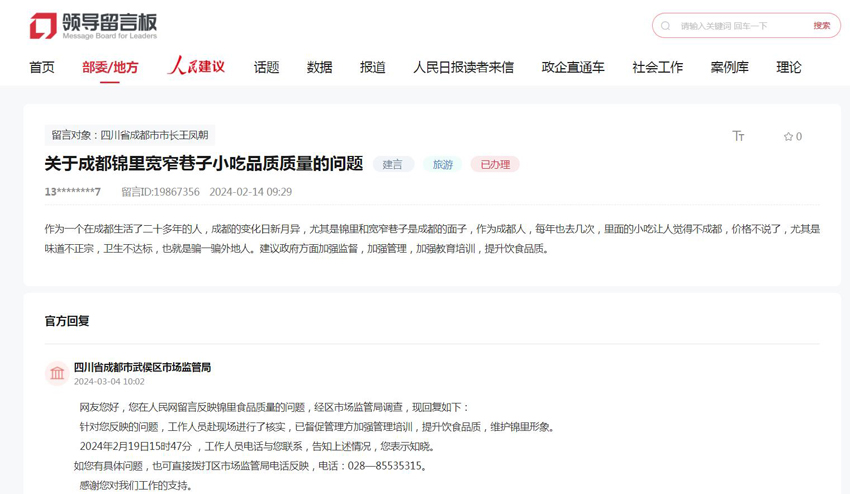 2月14日,有成都網民在人民網“領導留言板”反映錦里和寬窄巷子景區小吃品質質量的問題。3月4日,四川省成都市武侯區市場監管局在調查后進行了公開回復。