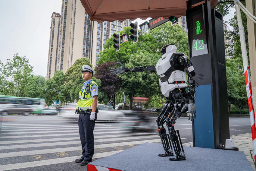 機器人勸導員與民警一起執勤。綿陽市公安局供圖