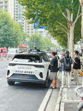 武漢市民近距離觀察“蘿卜快跑”。 四川日報全媒體記者 熊曉雨 攝