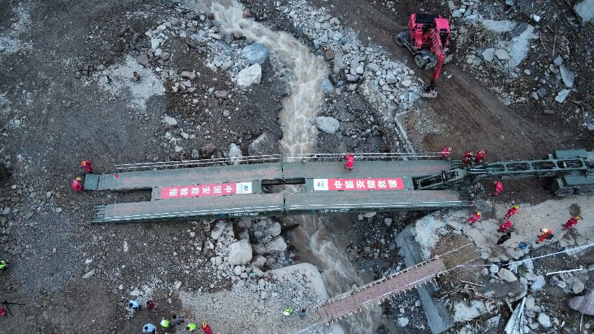 原本的石橋損壞后,救援隊伍用木板搭了一座臨時橋。7月21日晚上8點15分,就在受損的豆腐石橋位置,中國安能三局成功架設起一座應急機械化橋,解決了救援人員和重型機械通行問題,為后續人員搜救和應急保障提供了有力支撐。接下來,更多的大型機械將開進救援現場,搜救失聯人員、排危除險、消殺等工作仍在繼續。