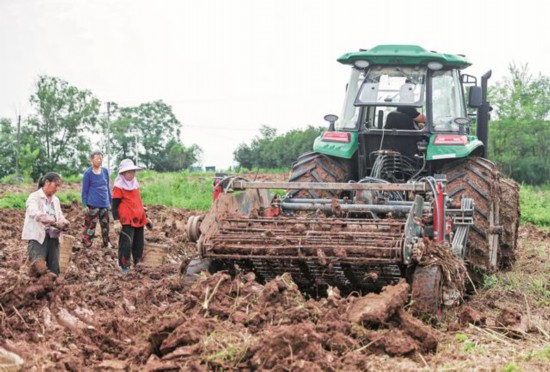 8月2日,涼水井村村民利用專用農機翻挖中藥材白芷。