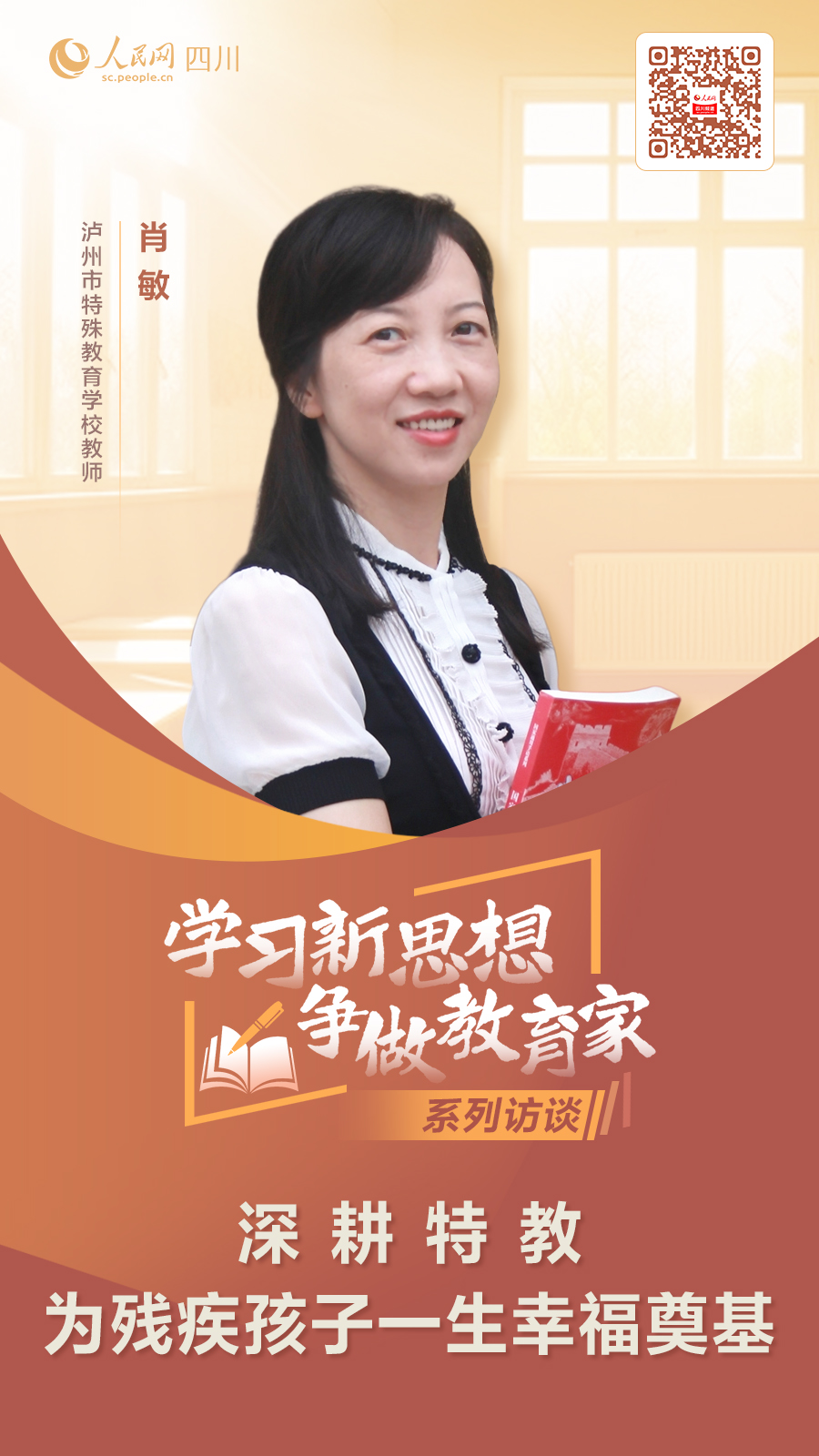 2024年9月10日是我國第40個教師節,主題是“大力弘揚教育家精神,加快建設教育強國”。根據教育部、人民日報社、全國少工委《關于在全國中小學開展2024“學習新思想 做好接班人”主題活動的通知》,由四川省教育廳指導,人民網四川頻道、四川省教師發展中心、四川省教育學會邀請川內40位教育工作者,開展“學習新思想 爭做教育家——人民網聚焦四川教育強省系列訪談”,全面展現廣大教育工作者堅定“躬耕教壇、強國有我”的志向與抱負,大力弘揚教育家精神,加快建設教育強省,以中國式現代化引領四川現代化建設的生動實踐。